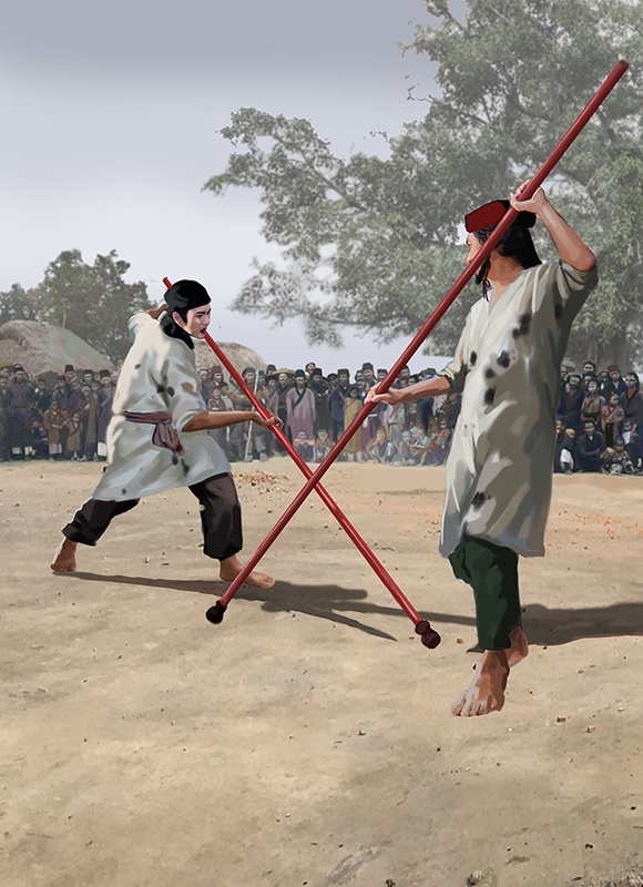 Vừa áp sát, hai đấu sĩ cùng lúc tung một đấm vào mặt đối phương. Tiếp theo đó là một tràng tay đấm chân đá, gạt đỡ búa xua. Đòn ra ngày một nhanh, mấy cụ già mắt kém tới giờ đã chẳng theo kịp nữa. Chương hầu sợ trận đấu đi quá xa liền đứng lên can ngăn, nhưng lời nói của ông bị chìm trong tiếng hò hét trợ hứng của đám thanh niên đang phấn khích tột độ.